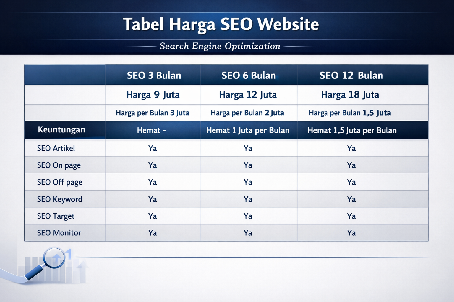 Layanan kami meliputi audit website, riset keyword, SEO On-Page, SEO Off-Page, backlink building, pembuatan konten SEO, hingga laporan perkembangan setiap bulan.